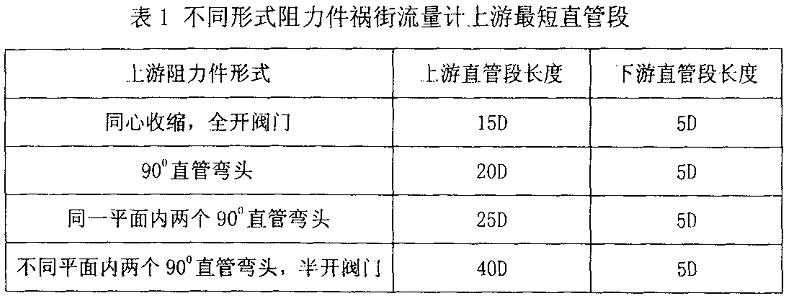 由于渦街流量計是利用流體自身的規(guī)則振蕩來計量流量的,因而對流體的速度分向及流動噪聲,比較敏感,因此在應(yīng)用過程中對管道安裝狀況要求較高。對L游不同形式的阻力件必須配置足夠長的滿足不同要求的直管段,以保證儀表的測量精度。表l給出了不同形式阻力件禍街流量計上游最短直管段。